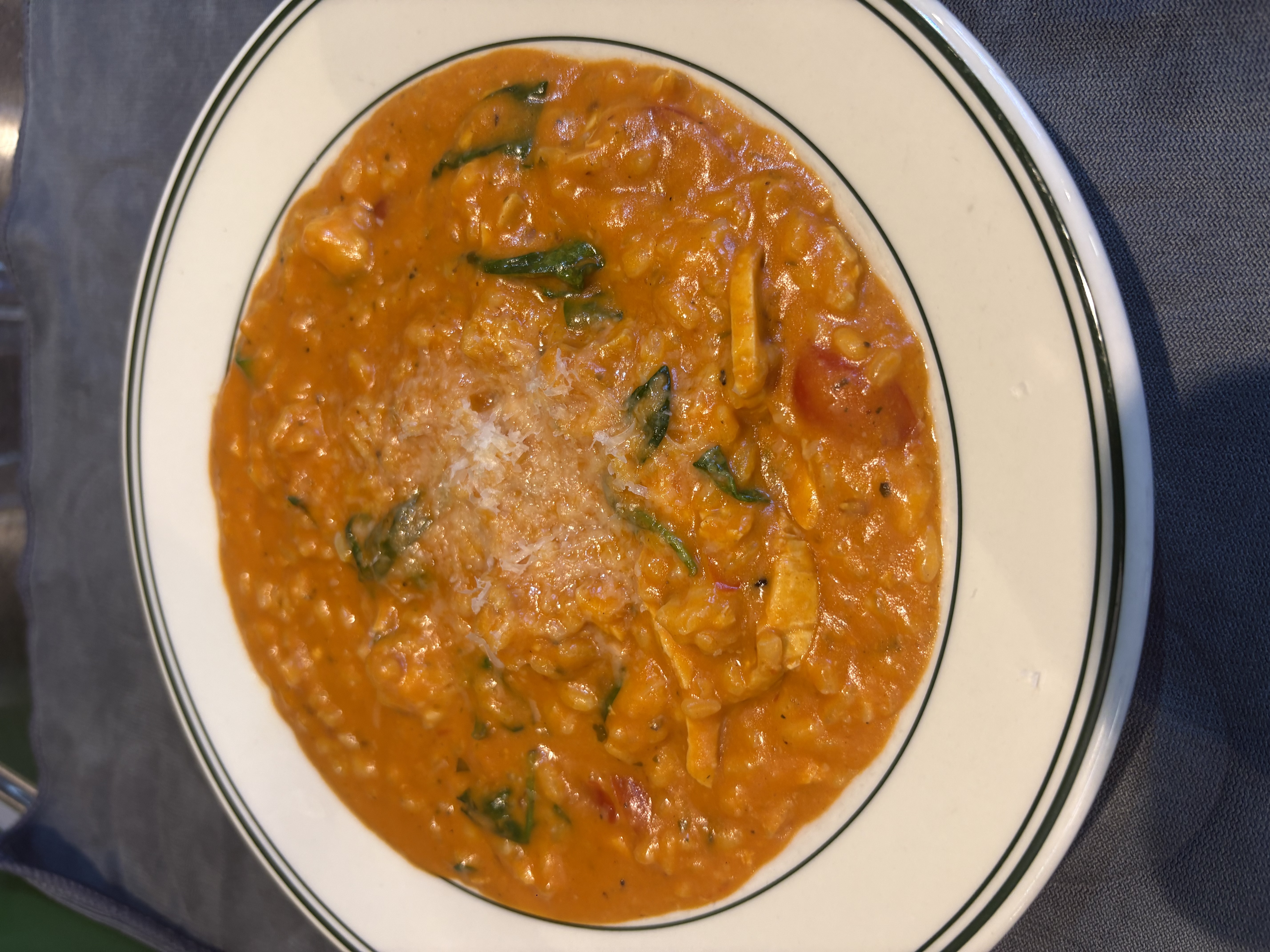 A creamy risotto featuring tender mushrooms, fresh spinach, and a rich blend of cream and Parmesan cheese, garnished with steamed broccoli.